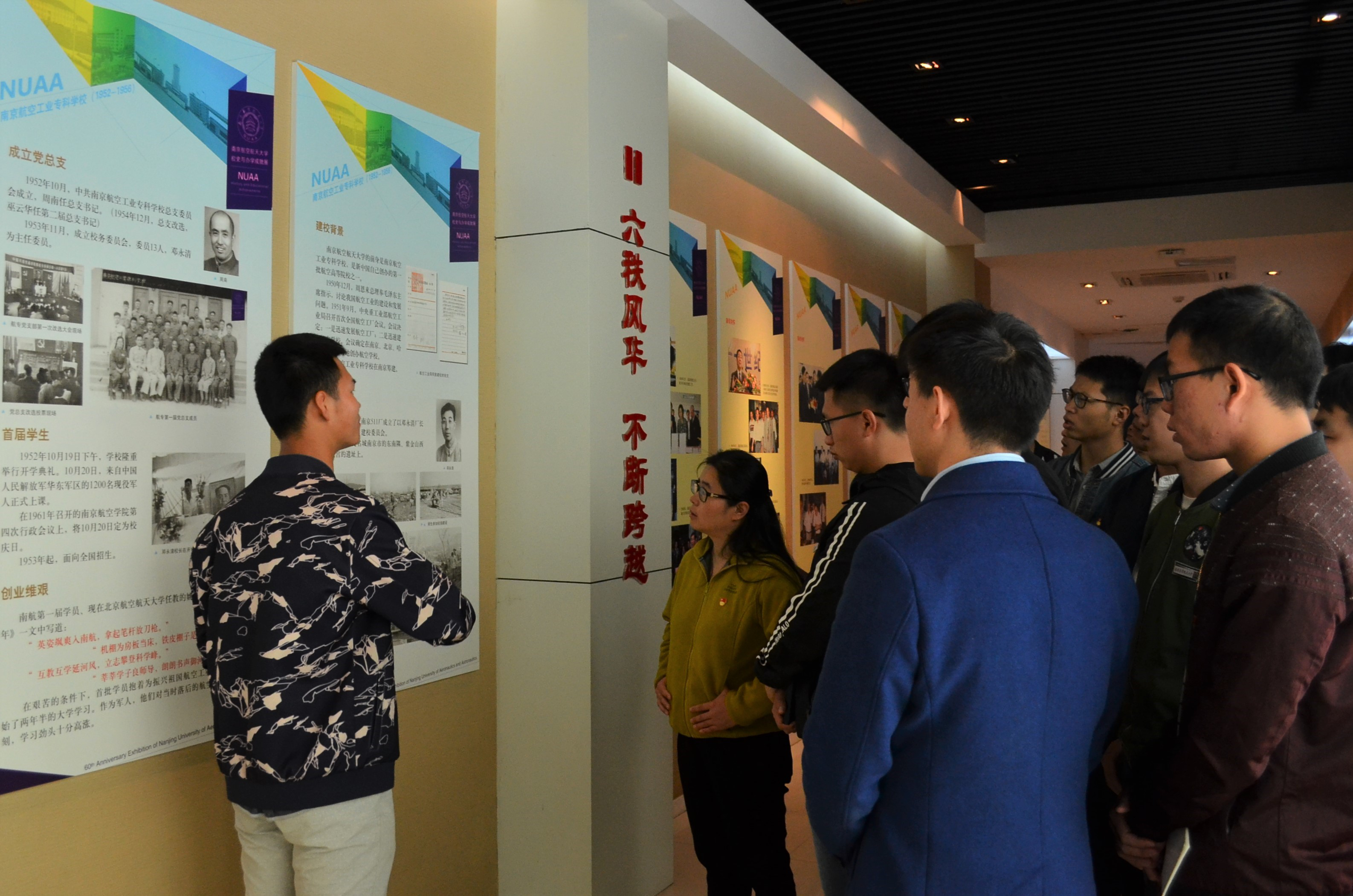 活动伊始,两个支部党员一同参观了南京航空航天大学校史馆。在讲解员的带领下,党员们回顾了南航66年的发展历史,专业的飞机模型、灿烂的荣誉奖章、金工实习用具等一些充满历史印记的场景吸引了大家的兴趣,党员们积极地和讲解员进行交流,认真聆听历史背后的故事。