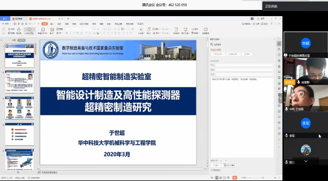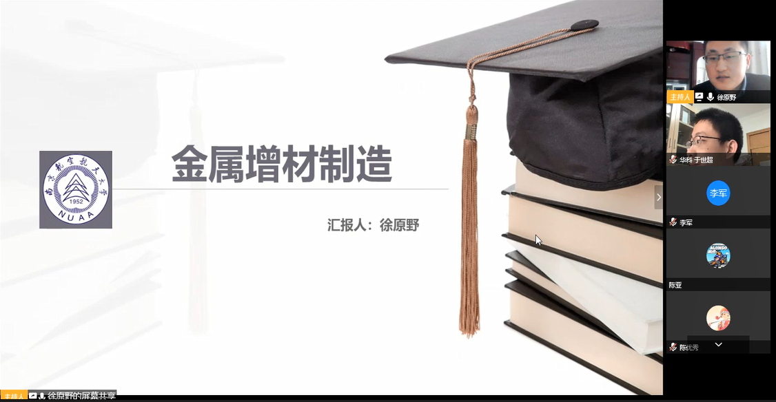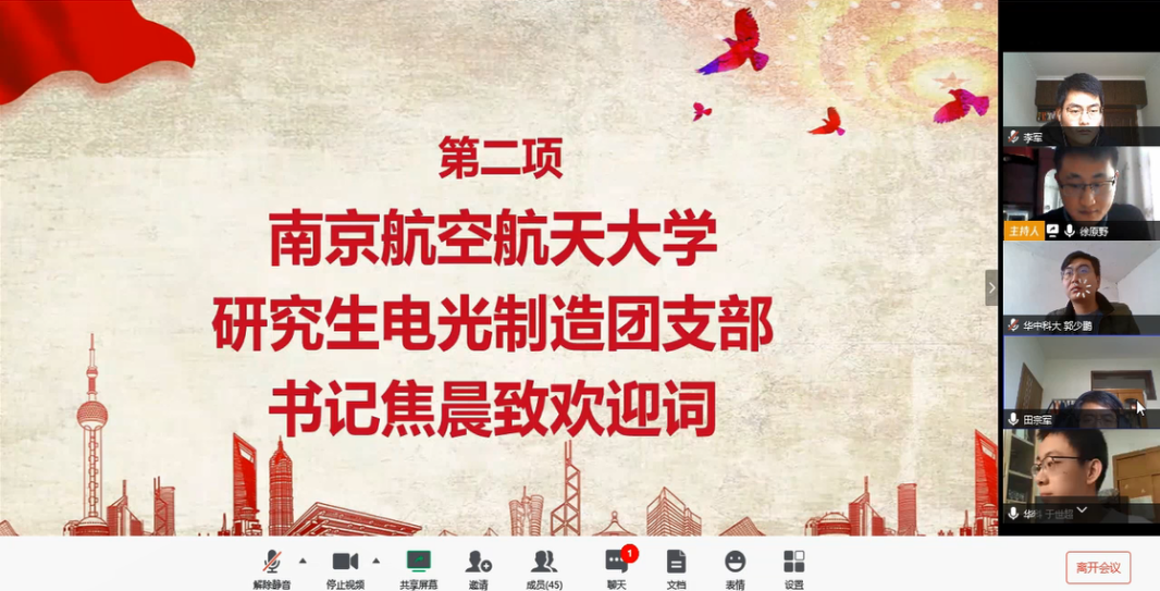本次联合团日活动依托腾讯会议平台在线上开展。参与此次团日活动的包括华中科技大学机械科学与工程学院硕士1906团支部团员和与南京航空航天大学研究生电光制造团支部团员,活动还邀请了电光制造团队田宗军教授、沈理达教授和邱明波副教授观摩指导。本次活动由电光制造团队徐原野主持,活动内容共分为五项。