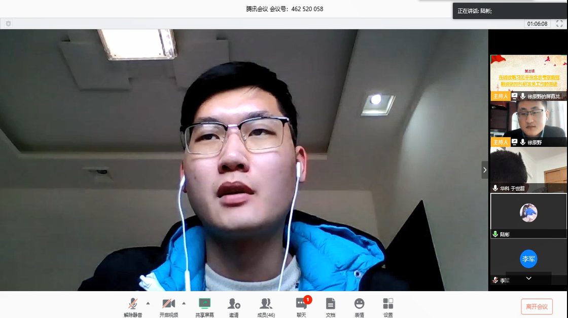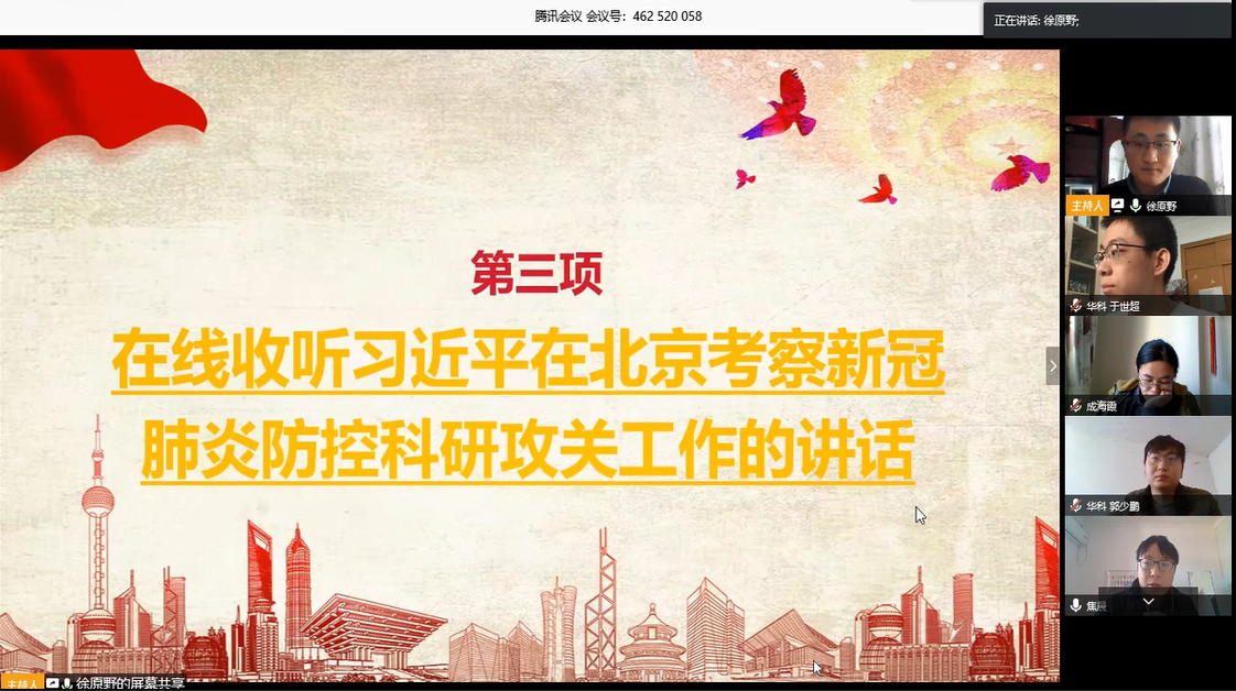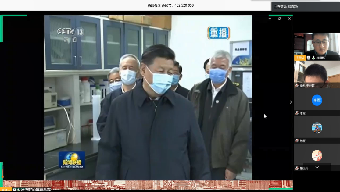 紧接着,全体成员在线收听习近平总书记在北京考察新冠肺炎防控科研攻关工作的重要讲话。自新型冠状病毒爆发以来,党和国家高度重视。在32日下午,习近平总书记亲自来到科研防“疫”一线,看望慰问一线科研工作者并提出殷切期望。总书记的期望对我们研究生具有重要指导意义,全体团员认真聆听总书记的嘱托。