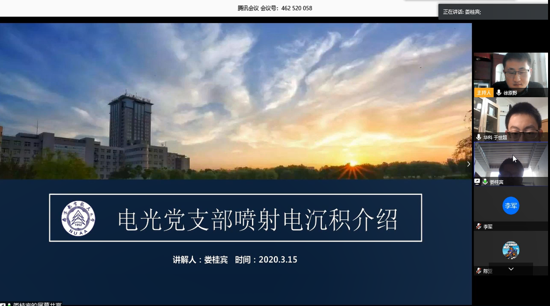 在全国抗“疫”局势严峻的态势下,作为一位研究生团员,我们能为抗疫做些什么?该如何担当起时代新人的责任?耽误的在校学习时间该如何弥补?…… 为了更好地引导研究生团员思考这些问题,南京航空航天大学研究生电光制造团支部与华中科技大学机械科学与工程学院硕士1906团支部于315日下午3点利用腾讯会议的形式举办了主题为“‘团’聚力量,齐心抗‘疫’”团日共建活动。