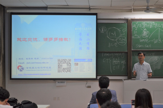 讲座伊始,姚佳烽首先通过讲述自己多年的学习经历、所见所闻以及国内外著名的医工结合实例,介绍了自己从事医工结合方面的研究背景。随后,他又向大家介绍了一些国内外医学电阻抗成像技术的实际应用情况,展示了医学电阻抗成像技术在新冠肺炎疫情期间发挥的重要作用,让同学们对该技术有了初步的认识。