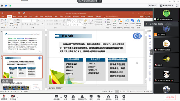 9月29日,郭勤涛从研究方向、项目成果、关键技术、成员介绍等方面详细介绍了设计工程系每个科研团队的情况。他讲到,该系在教学和科研方面获得过江苏省精品课程、国防科学技术一等奖等众多奖项,并且拥有多个重点实验室,团队的师资力量科研成果都处于国内领先水平。同时,郭勤涛邀请到仿生结构与材料防护研究所所长戴振东教授与同学们互动交流,对同学们提出有关课程设置、研究方向等问题进行了解答。随后,周海海从师资队伍和科研方向两方面介绍了工业设计系,他指出,工业设计系目前拥有四个重要科研教学平台,科研方面,近五年来承担国家科学自然基金、江苏省人文社会科学研究项目、研究所及企业工业设计项目五十余项,多次获得省部级工业设计奖项,在航空航天产品、高端机电装备、轨道交通领域工业设计已持续研究近十年,处于国内领先水平。最后就研究生的科研方向与同学们进行了详细交流。