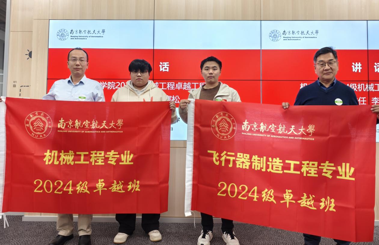 在授旗仪式环节,安鲁陵与李寒松为机械工程、飞行器制造工程“卓越班”授旗,两班班长代表班级接旗。